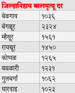 आरोग्य व्यवस्थापन माहिती व्यवस्था (एचएमआयएस) सॉफ्टवेअरमध्ये नोंदविलेल्या आकडेवारीनुसार 2022 मध्ये बालमृत्यूचे प्रमाण जास्त होते. तथापि, 2023-24 मध्ये त्यात थोडीशी घट झाली असली तरी 2024-25 मध्ये पुन्हा वाढ झाली आहे. मॉडेल रजिस्ट्रेशन सिस्टम (एसआरएस) अहवालानुसार कर्नाटकातील बालमृत्यू दर प्रति एक हजार जिवंत जन्मामागे 12 पर्यंत कमी झाला आहे. देशातील ही सरासरी 26 इतकी आहे. उत्तरप्रदेश, मध्यप्रदेश आणि राजस्थानमध्ये देशात सर्वाधिक बालमृत्यूदर आहे. तर केरळमध्ये मृत्यूदर प्रति एक हजार जिवंत जन्मामागे 5 इतका आहे.