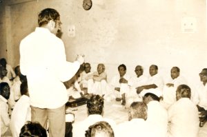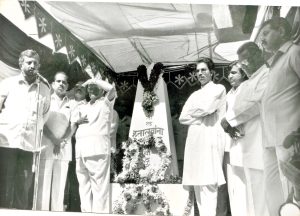 व्ही. वाय. चव्हाण बोलताना. मागे बसलेले शरद पवार, साथी किशोर पवार, एस. एम. जोशी, शिवसेना प्रमुख बाळासाहेब ठाकरे व छगन भुजबळ, निंगोजी हुद्दार, एन. डी. पाटील आदी.