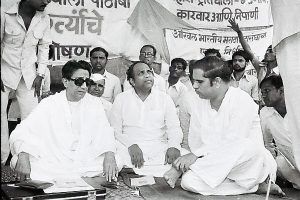 उपोषणप्रसंगी शरद पवार, शिवसेना प्रमुख बाळासाहेब ठाकरे व मनोहर जोशी.