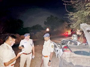 भरधाव कार दोन दुचाकीवाल्यांना चिरडून झाडावर आदळल्याने वाहनाचा चक्काचूर झाला होता. ही कार नेमकी कोणती होती हेही घटनास्थळी समजण्यासारखी स्थिती नव्हती. त्यामुळे कार भरधाव वेगाने जाऊन झाडावर आदळल्याचे घटनास्थळी स्पष्टपणे दिसत होते. कार जोराने आदळल्याने मोटारीतील मृतदेह चिरडून आतमध्ये अडकले होते. पोलीस व स्थानिकांनी प्रयत्न करून कारमधील मृतदेह बाहेर काढले.