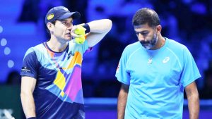 या स्पर्धेमध्ये पुरुष दुहेरीत भारताच्या रोहन बोपन्ना आणि त्याचा ऑस्ट्रेलियन साथीदार मॅथ्यु एब्डन यांची उपांत्य फेरी गाठण्याची आशा जवळपास संपुष्टात आली आहे. या जोडीला सलग दुसऱ्या पराभवाला सामोरे जावे लागले. एल साल्व्हादोरचा मार्सेलो अॅरेव्हेलो आणि त्याचा क्रोएशियाचा साथीदार पेव्हीक यांनी बोपन्ना आणि एब्डन यांचा 7-5, 6-3 अशा सरळ सेटमध्ये पराभव केला. आता बोपन्ना आणि एब्डन यांचाप्राथमिक गटातील शेवटचा सामना जर्मनीच्या क्रेव्हेज आणि पझ यांच्या बरोबर होणार आहे. बोपन्नाने एटीपी फायनल्स ही स्पर्धा यापूर्वी दोनवेळा जिंकली असून गेल्यावर्षी जानेवारीत त्याने एटीपीच्या दुहेरी मानांकनात अग्रस्थान मिळविण्याचा इतिहास घडविला होता. बोपन्नाने वयाच्या 43 व्या वर्षी हा पराक्रम केला.