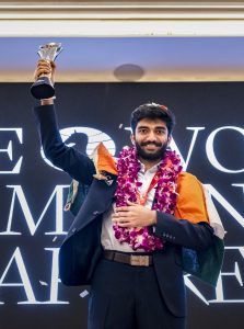 चेन्नईच्या या 18 वर्षीय तऊणाने गुऊवारी गतविजेत्या चीनच्या डिंग लिरेनला पराभूत करून ऐतिहासिक विजय मिळवला. तो एकूण 18 वा आणि विश्वनाथन आनंदनंतर हा मुकुट जिंकणारा दुसरा भारतीय ठरला आहे. या विजयाने त्याला 1.3 दशलक्ष डॉलर्सचे इनाम प्राप्त झाले आहे. शुक्रवारी सकाळी सुऊवात चषकाची झलक मिळून झाली, ज्याला त्याने स्पर्श करण्यास नकार दिला. कारण त्याला संध्याकाळी होण्राया समारोप समारंभापर्यंत थांबायचे होते. फिडेचे (इंटरनॅशनल चेस फेडरेशन) अध्यक्ष अर्काडी ड्वोरकोविच यांनी त्याला प्रदान केल्यावर शेवटी त्याने तो चषक हातात धरला.
