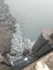 दुधगाव बंधाऱ्याजवळ मृत माशांचा खर्च