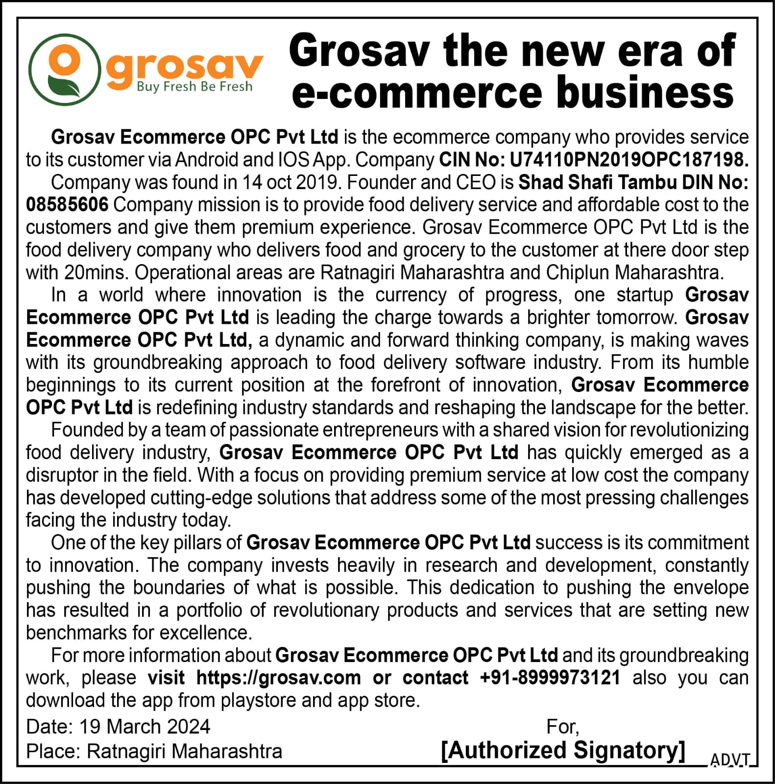 Grosav Ecommerce OPC Pvt Ltd ही ई-कॉमर्स कंपनी आहे. जी आपल्या ग्राहकांना Android आणि IOS ॲपद्वारे सेवा प्रदान करते. कपंनीच्या कार्याविषयी अधिक माहितीसाठी खालील जाहिरात वाचा. तसेच https://grosav.com ला भेट द्या किंवा +91-8999973121 वर संपर्क साधा. तुम्ही playstore आणि app store वरून ॲप डाउनलोड करू शकता.
