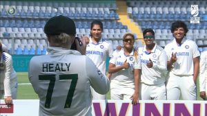 संक्षिप्त धावफलक : ऑस्ट्रेलिया प.डाव 219 व दुसरा डाव 105.4 षटकांत सर्वबाद 261 (बेथ मुनी 33, एलिस पेरी 45, ताहलिया मॅकग्रा 73, अॅलिसा हिली 32, सदरलँड 27, स्नेह राणा 4 बळी, राजेश्वरी गायकवाड व हरमनप्रीत प्रत्येकी दोन बळी).