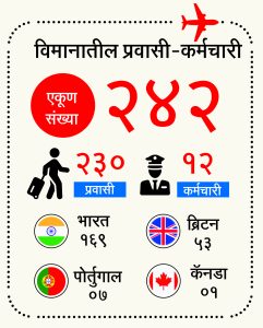 या विमानातून ब्रिटनचे 53, पोर्तुगालचे 7 तर कॅनडाचा 1 असे 61 विदेशी नागरिक प्रवास करीत होते. त्यांचाही या दुर्घटनेत मृत्यू झाला. ब्रिटनच्या सरकारने भारत सरकारशी संपर्क केला असून स्थितीसंबंधी माहिती घेतली. विमानातील प्रवाशांमध्ये 169 भारतीय आणि अन्य विदेशी प्रवासी होते, असे समजते.