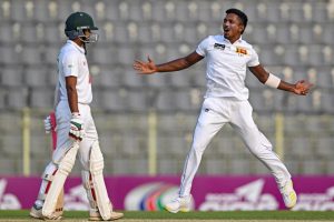 बांगलादेशला लंकेकडून निर्णायक विजयासाठी 511 धावांचे कठीण आव्हान मिळाल्यानंतर बांगलादेशचा दुसरा डाव दडपणाखाली कोलमडला. शेवटच्या तासभराच्या कालावधीत लंकेच्या भेदक गोलंदाजीसमोर बांगलादेशचा निम्मा संघ 47 धावात तंबूत परतला. झकीर हसनने 2 चौकारांसह 19 धावा जमवल्या. मेहमुदुल हसन जॉयला तसेच शहदात हुसेन आणि लिटॉन दासला आपले खातेही उघडता आले नाही. कर्णधार शांतोने 6 धावा जमवल्या. मोमीनुल हक 7, तर ताजुल इस्लाम 6 धावावर खेळत आहेत. या कसोटीतील खेळाचे दोन दिवस बाकी असून लंकेचा संघ सोमवारी खेळाच्या चौथ्या दिवशी आपल्या मोठ्या विजयावर शिक्कामोर्तब करेल. लंकेतर्फे विश्वा फर्नांडोने 13 धावात 3 तर रजिता आणि कुमारा यांनी प्रत्येकी एक गडी बाद केला.