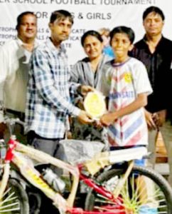 स्पर्धेच्या बक्षीस समारंभाला प्रमुख पाहुणे सोहल संगोळी, सुनील पाटील मॅन्युअल डिव्रुझ, बसवराज अक्षयमनी, नौशाद जमादार, चंद्रकांत पाटील, मानस नायक, यांच्या हस्ते विजेत्या उपविजेत्या संघांना चषक प्रमाणपत्र देऊन गौरविण्यात आले, स्पर्धेतील उदयोन्मुख खेळाडू मानव शिंदे, सेंट झेवियर्स, उत्कृष्ट स्ट्रायकर-लुकमन लव्हडेल, उत्कृष्ट डिफेन्डर-अनिकेत पाटील सेंट झेवियर्स, उत्कृष्ट मिडफिल्ड-प्रज्वल कितुर मराठी विद्यानिकेतन, उत्कृष्ट गोलरक्षक-आरूष कडोलकर महिला विद्यालय, अंतिम सामन्यातील सामनावीर-आबुजर तिगडी, शिस्तबद्ध संघ सेंट फ्रान्सिस डि सेल स्कूल उचगांव, स्पर्धेतील सर्वोत्तम खेळाडू हुसेन जमादार यांला सायकल देऊन गौरविण्यात आले. याप्रसंगी पंच इम्रान बंदार, किरण के अमन सय्यद, ताहीर बेपारी, आदर्श गणेशकर, वसुंधरा चव्हाण किंजल जाधव, साक्षी चिटगी, श्रावणी सुतार, प्रांजल हजारे, श्र्रद्धा पाटील, सेजल तेजल हंसी उपस्थित होते.