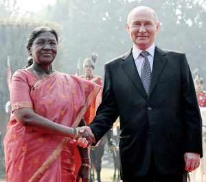 भारताच्या राष्ट्रपती द्रौपदी मुर्मू यांनी भारताच्या दौऱ्यावर असलेले रशियाचे अध्यक्ष व्लादिमीर पुतीन यांचा प्रथेप्रमाणे सन्मान केला आहे. शुक्रवारी सकाळी अध्यक्ष पुतीन यांचे राष्ट्रपती भवनात औपचारिक स्वागत आले. या कार्यक्रमाला पंतप्रधान नरेंद्र मोदी, उपराष्ट्रपती राधाकृष्णन, अनेक केंद्रीय मंत्री आणि भारतातील मान्यवर उद्योगपतींचा सहभाग लाभला होता. अध्यक्ष पुतीन यांच्यासाठी राष्ट्रपती मुर्मू यांनी शाही स्नेहभोजनाच्या कार्यक्रमाचेही आयोजन केलेले होते.