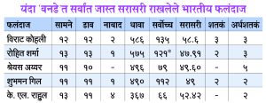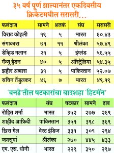 गेल्या दशकाच्या अखेरीस विराट कोहलीनं तीन वर्षांहून अधिक काळ अग्रक्रमांक स्वत:जवळ ठेवला होता. एप्रिल, 2021 मध्ये पाकिस्तानच्या बाबर आझमनं त्याला तेथून हटविल्यापासून तो परत त्याला गवसणी घालू शकलेला नाही...झारखंडच्या राजधानीत रोहित शर्मानंही नोंद केली षटकार हाणण्याच्या बाबतीत .जागतिक विक्रमाची (269 डावांत 352 षटकार)...विराटनं 52 वं नि 53 वं एकदिवसीय शतक फटकावत क्रिकेटच्या कुठल्याही स्वरुपातील सर्वाधिक शतकांचा महान सचिन तेंडुलकरचा जागतिक विक्रम मोडीत काढलाय (कसोटी सामन्यांत 51 शतकं)...44 वेळा सर्वोत्तम खेळाडूचा मान पटकावणाऱ्या कोहलीच्या कारकिर्दीतील ते ठरलंय एकंदरित 84 वं शतक...