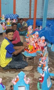 गणेश चतुर्थीचा सण अवघ्या दोनच दिवसावर येऊन ठेपला आहे. त्यामुळे येथील मूर्तिकारांची गणेशमूर्तीवर रंगकामाबरोबरच रेखणीचा अखेरचा हात फिरवण्याचे काम अंतिम टप्प्यात आले आहे. या भागातील मूर्तिकार शेडूच्या शेकडो मुर्तीं बनविल्या असून गेल्या आठ-दहा दिवसापासून आपल्या परिवारासह गणेशमूर्तींना अहोरात्र रंगकाम देण्याचे कार्य सुरू ठेवले आहे. सध्या मूर्ती रेखणी करून आकर्षक सजावट करण्याचे कार्य सुरू असून ते अंतिम टप्प्यात असल्याचे त्यांनी सांगितले. गेल्या पंधरा-वीस वर्षापासून ते गणेशमूर्ती बनविण्याचे कार्य करीत असून येथील सुप्रसिद्ध मूर्तिकार आणि चित्रकार कै. विठ्ठल कुंभार यांचे ते शिष्य होत. पूर्वी विठ्ठल कुंभार यांच्या मोठमोठ्या गणेशमूर्ती बेळगावसह, कोल्हापूर, गोवा येथे जात असत. त्यामुळे आजही या भागामध्ये येथील शेडूच्या पर्यावरणपूरक मूर्तींना मोठी मागणी आहे.