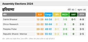 हरियाणा विधानसभेसाठी दैनिक भास्करच्या एक्झिट पोलने काँग्रेसला 44 ते 54 आणि भाजपला 15 ते 29 जागा दिल्या आहेत, तर ध्रुव रिसर्चने भाजपला 22 ते 32 आणि काँग्रेसला 50 ते 64 जागा दाखवल्या आहेत. पीपल्स पल्सच्या एक्झिट पोलने काँग्रेसला 49 ते 61 आणि भाजपला 20 ते 32 जागा दिल्या आहेत. तसेच रिपब्लिक भारत-मॅट्रीझने काँग्रेसला 55 ते 62 जागा आणि भाजपला 18 ते 24 जागा मिळतील, असा अंदाज व्यक्त केला आहे. हरियाणातील विधानसभेच्या 90 जागांसाठी शनिवारी एकाच टप्प्यात मतदान झाले. हरियाणात 2014 पासून भारतीय जनता पक्षाचे सरकार असून मनोहरलाल खट्टर हे 2014 ते मार्च 2024 पर्यंत मुख्यमंत्री होते. सध्या येथे नायबसिंग सैनी हे पद सांभाळत असले तरी हरियाणातील सत्ता भाजपच्या हातून निसटण्याचा अंदाज एक्झिट पोलमध्ये वर्तवण्यात आला आहे.