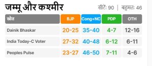 जम्मू-काश्मीरच्या एक्झिट पोलमध्ये (90 जागा) काँग्रेस आणि एनसी आघाडीवर आहेत. पीपल्स पल्सच्या एक्झिट पोलमध्ये काँग्रेसला 46 ते 50 असे बहुमत मिळण्याचा अंदाज वर्तवण्यात आला आहे. दैनिक भास्करने 35 ते 40 जागा म्हणजेच त्रिशंकू सरकारचा अंदाज व्यक्त केला आहे. इंडिया टुडे आणि सी व्होटरच्या एक्झिट पोलमध्ये भाजपला 27-32 जागा, काँग्रेस आणि एनसीला 40 ते 48, पीडीपीला 6-12 आणि इतरांना 6-11 जागा मिळण्याची शक्मयता वर्तवण्यात आली आहे. या एक्झिट पोलच्या निकालांनुसार, जम्मू-काश्मीरमध्ये काँग्रेस आणि एनसी यांचे सरकार स्थापन होऊ शकते.