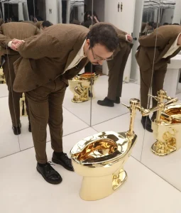 हे जग स्वत:च्या चित्रविचित्र छंदासाठी ओळखले जाते. सध्या एका टॉयलेट सीटची चर्चा हो आहे. याला गोल्डन टॉयलेट म्हटले जात आहे. अमेरिकेत पुन्हा एकदा अनोख्या कलाकृतीने लोकांना थक्क करून सोडले आहे. मॉरिजियो कॅटलन या कलाकाराची ही कलाकृती असून त्यांनी यापूर्वी भिंतीवर केळ्याला टेप करत जगभरात प्रसिद्धी मिळविली होती.